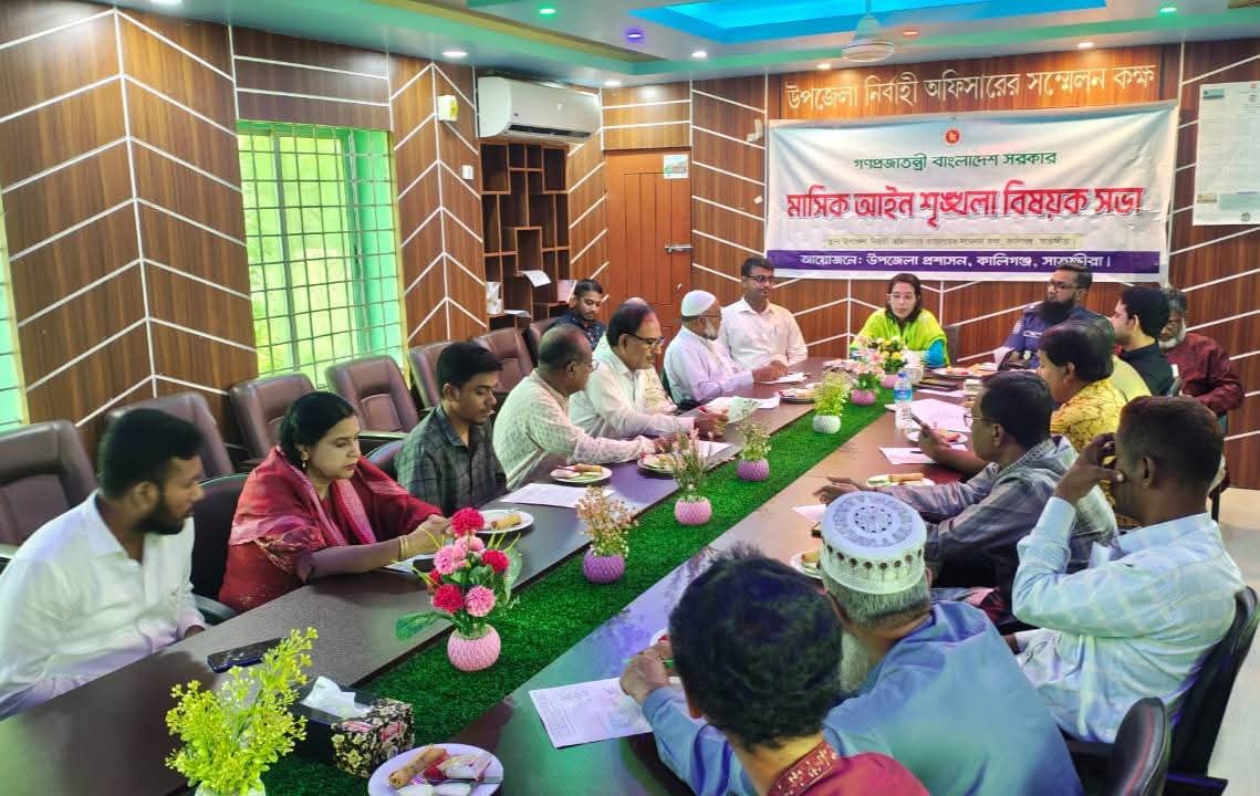 সাতক্ষীরার কালীগঞ্জে উপজেলা প্রশাসনের আয়োজনে আইন-শৃঙ্খলা বিষয়ক মাসিক সভা অনুষ্ঠিত হয়েছে। বৃহস্পতিবার (৬ নভেম্বর) সকালে উপজেলা নির্বাহী কর্মকর্তার সম্মেলন কক্ষে অনুষ্ঠিত এ সভায় উপজেলার সার্বিক আইন-শৃঙ্খলা পরিস্থিতি নিয়ে আলোচনা করা হয়। সভায় সভাপতিত্ব করেন উপজেলা নির্বাহী কর্মকর্তা অনুজা মণ্ডল।